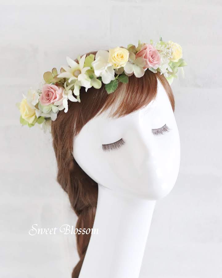 花冠はサイズ52cm程度でお作りし、後ろ側をリボンで大きさい調節できるように制作いたします。