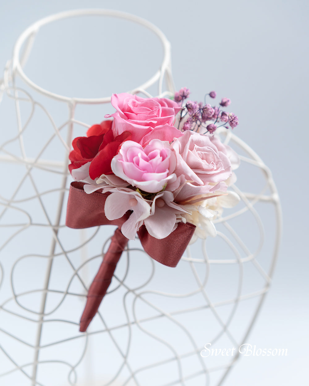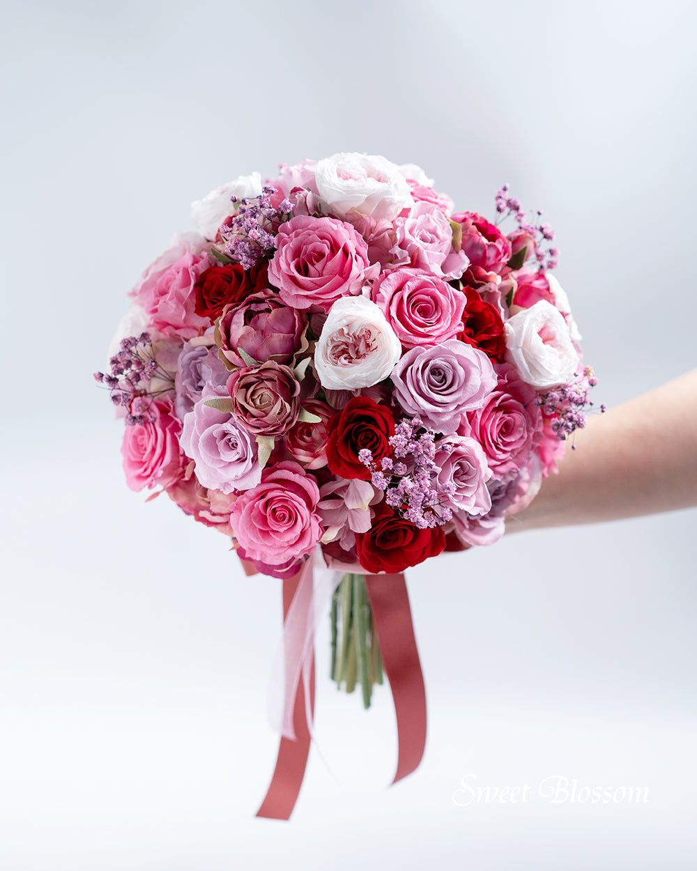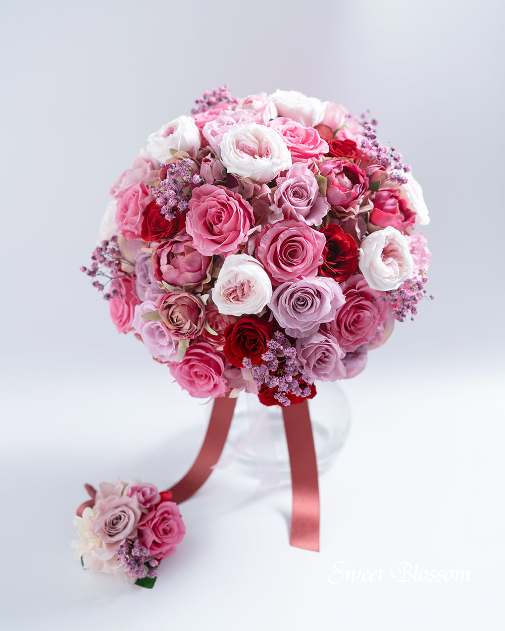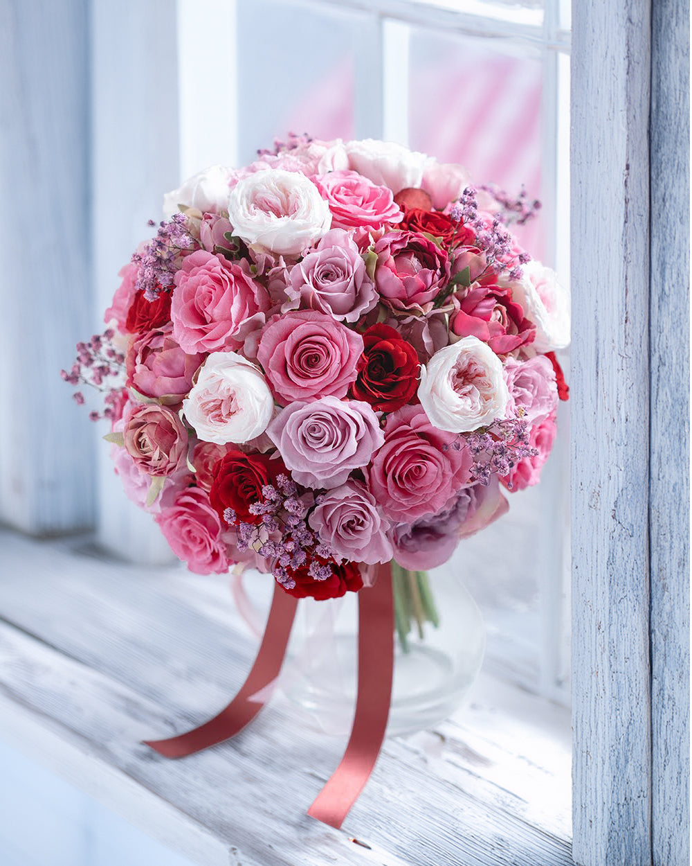 写真はオーダーメイドでご注文いただいた作品の一例で、プリザーブドフラワーのピンク系グラデーションを中心にワインレッドをアクセントに加えてお花いっぱいのボリュームあるクラッチブーケです。
