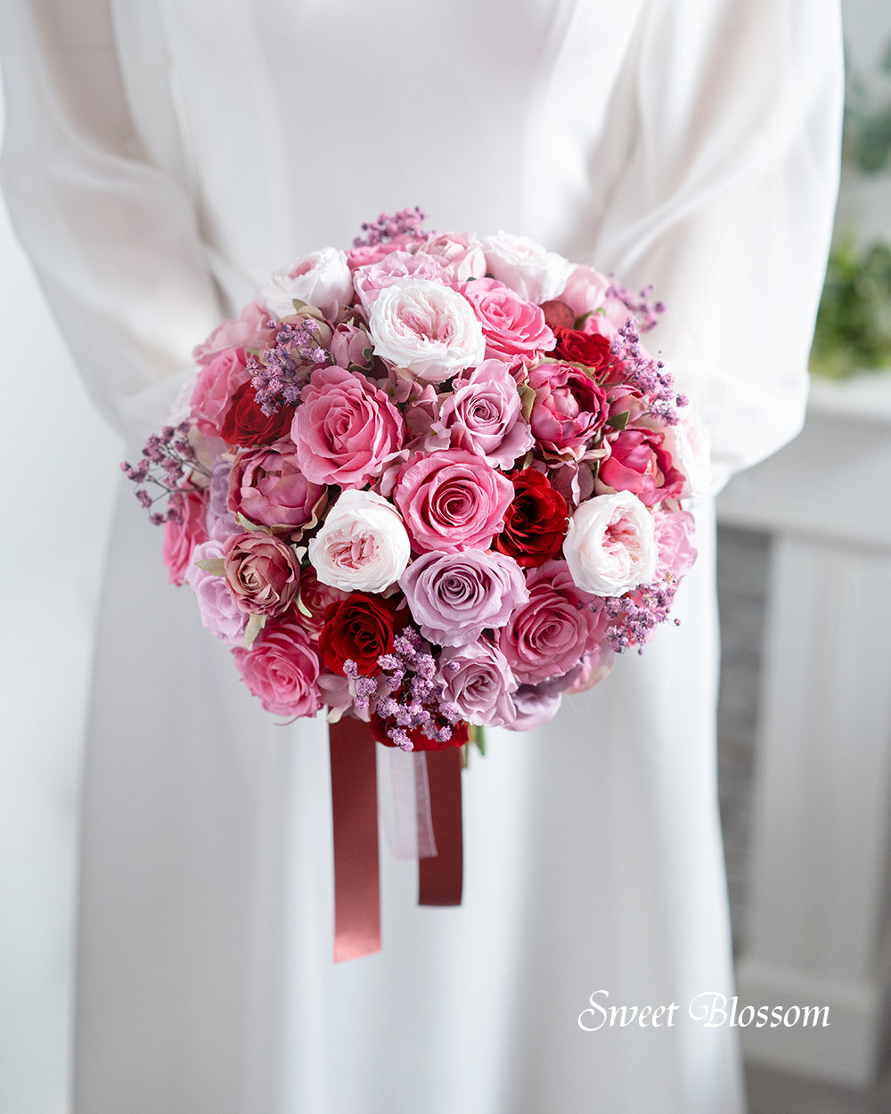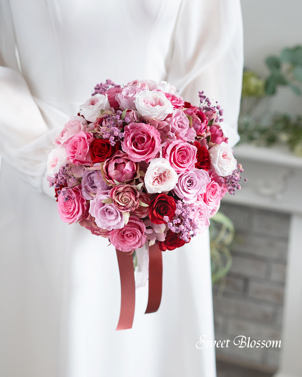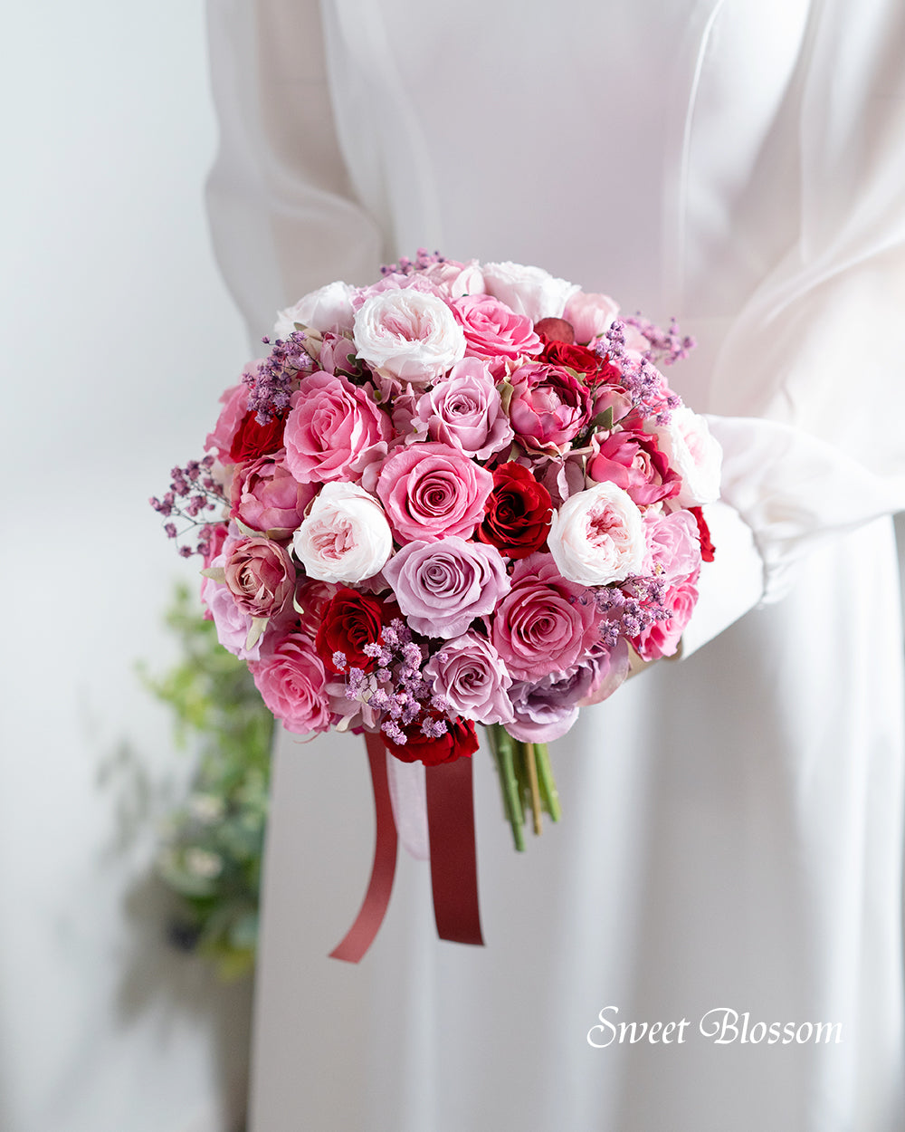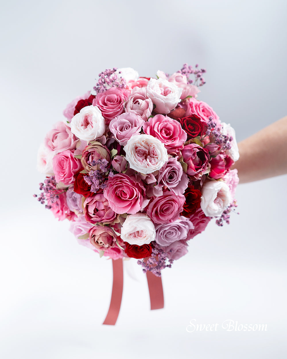 写真はオーダーメイドでご注文いただいた作品の一例で、プリザーブドフラワーのピンク系グラデーションを中心にワインレッドをアクセントに加えてお花いっぱいのボリュームあるクラッチブーケです。