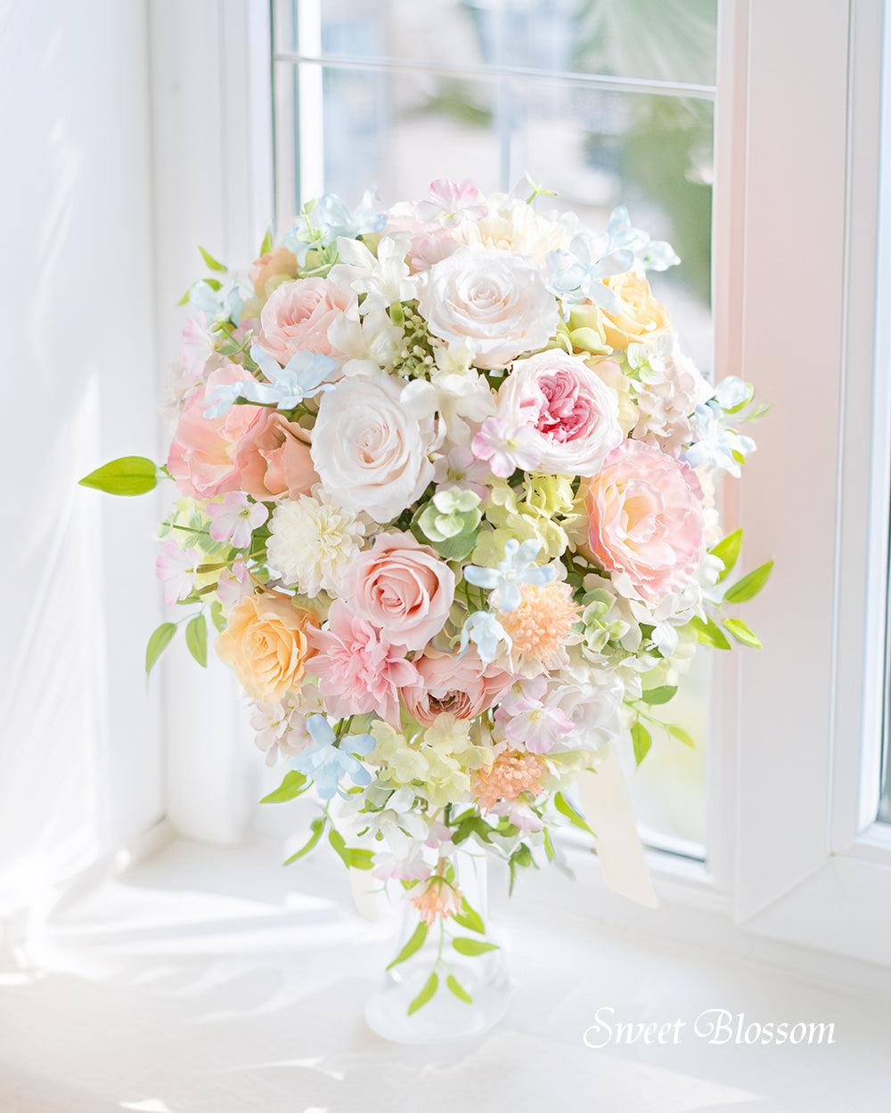 掲載写真と同じブーケのご希望も承りますのでご注文前にお問い合わせください。(但し作品に使用している花材が廃盤やリニューアル等により花材は代替品を使用することがございます。)