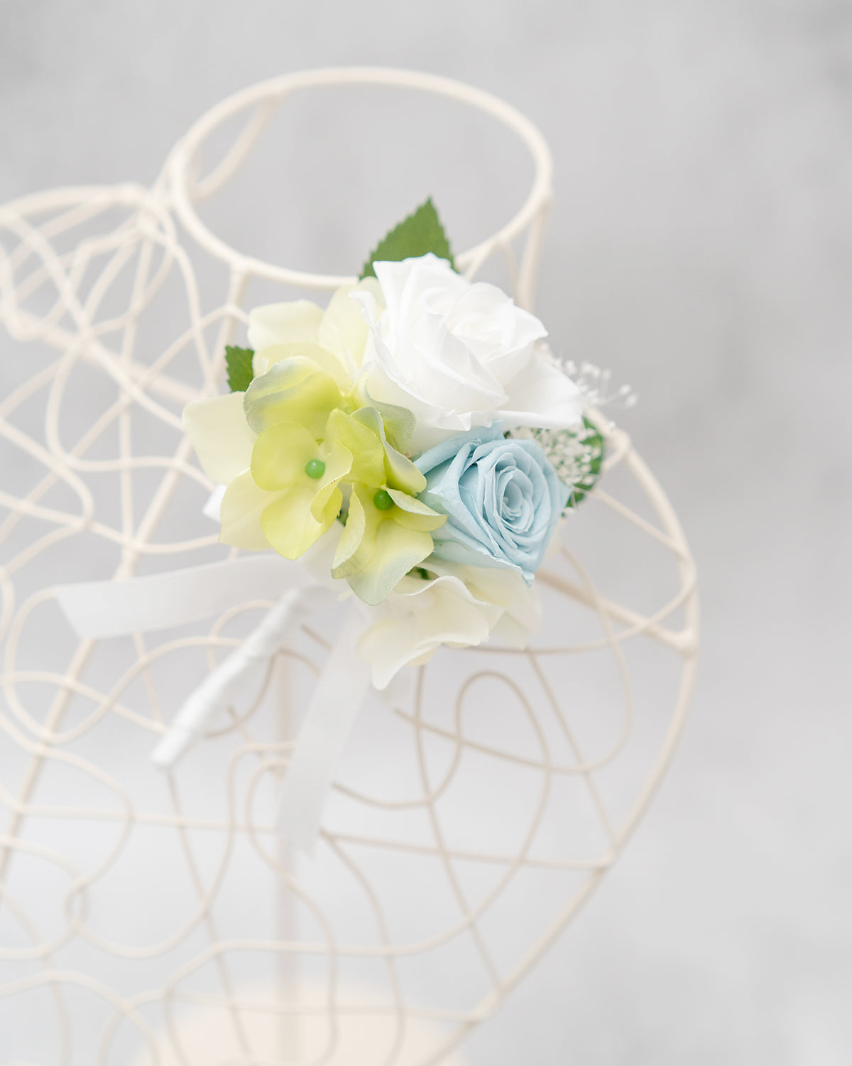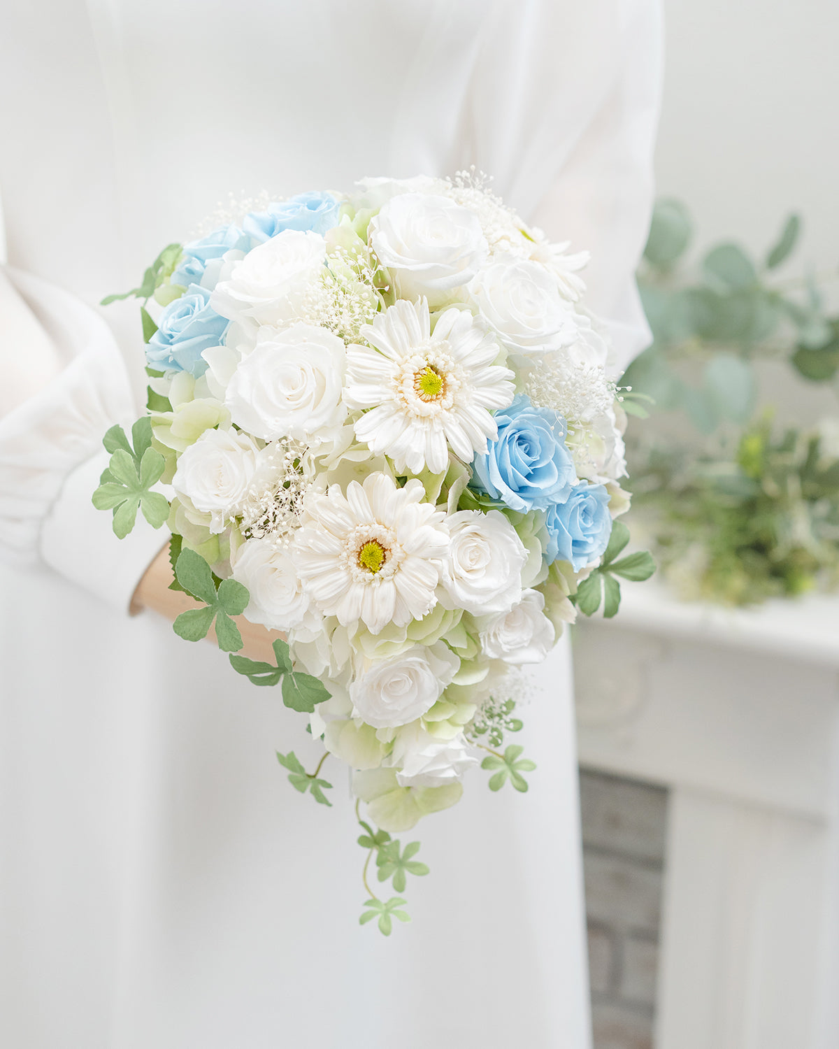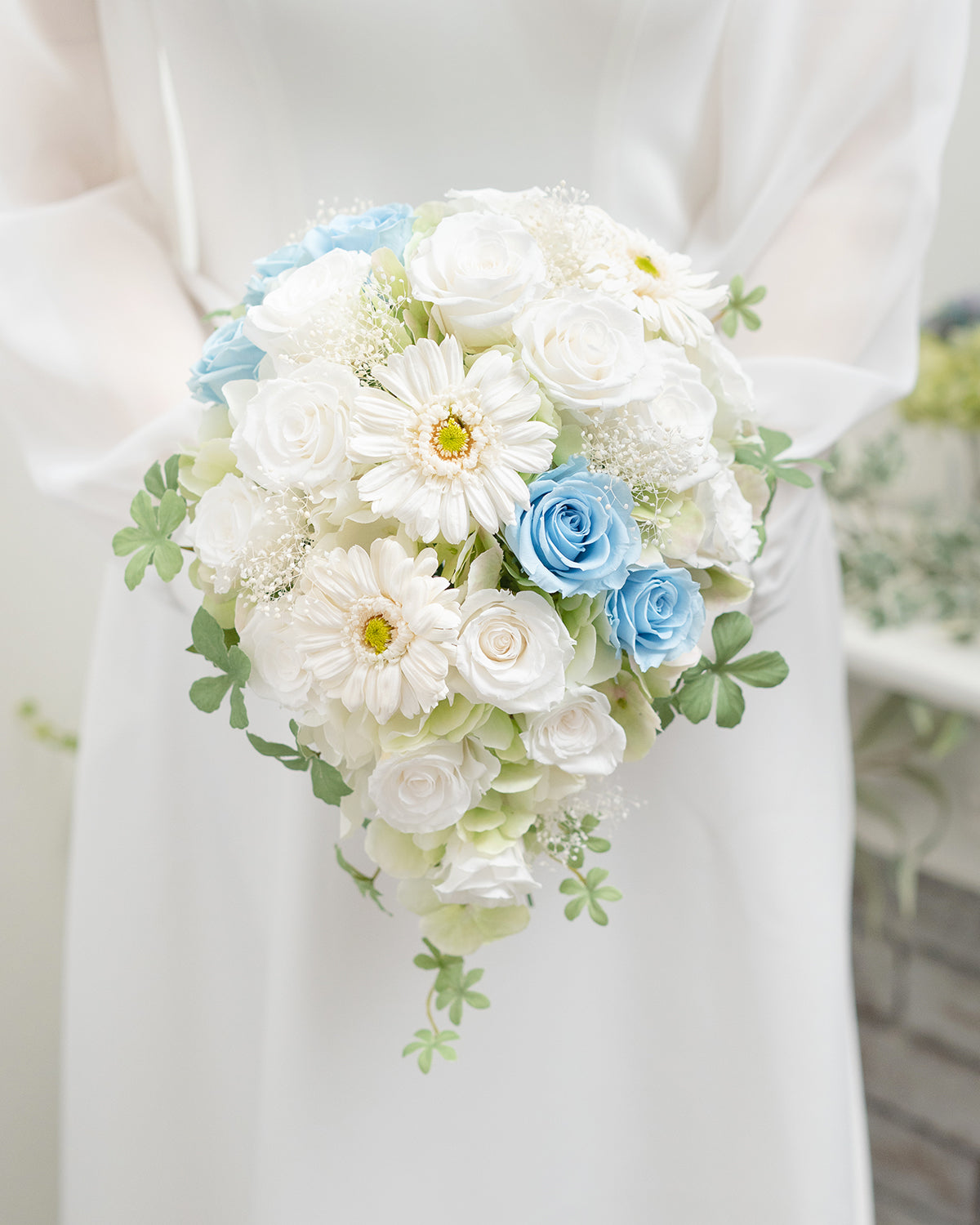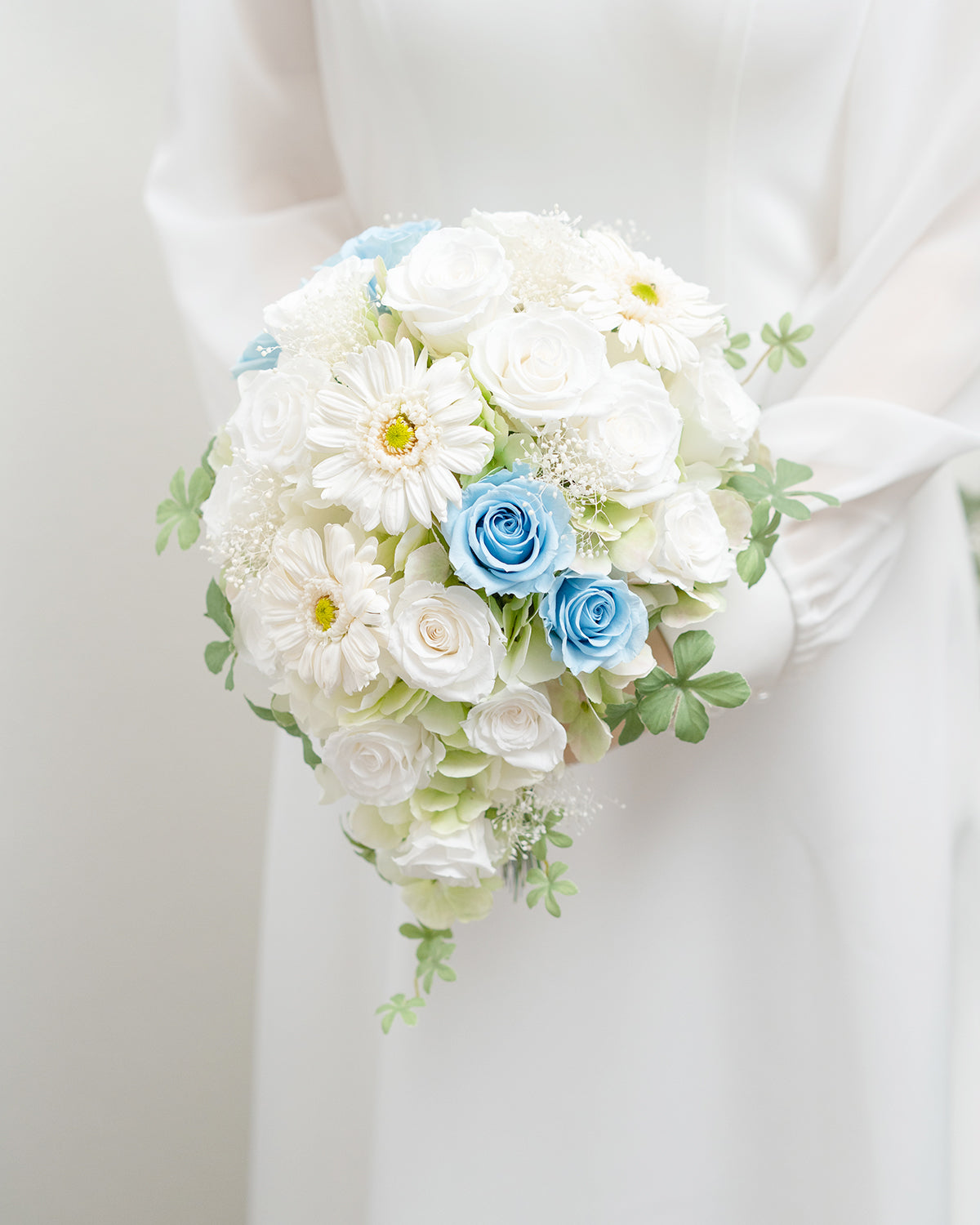 プリザーブドフラワーの白バラをメインに白のガーベラ、水色のバラをアクセントに色合わせし、小花にかすみ草を加えたティアドロップブーケです。