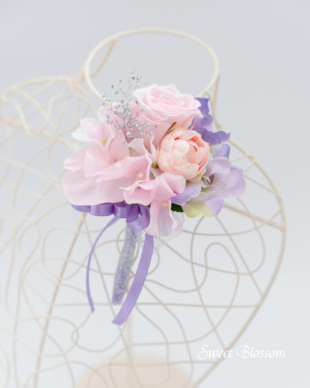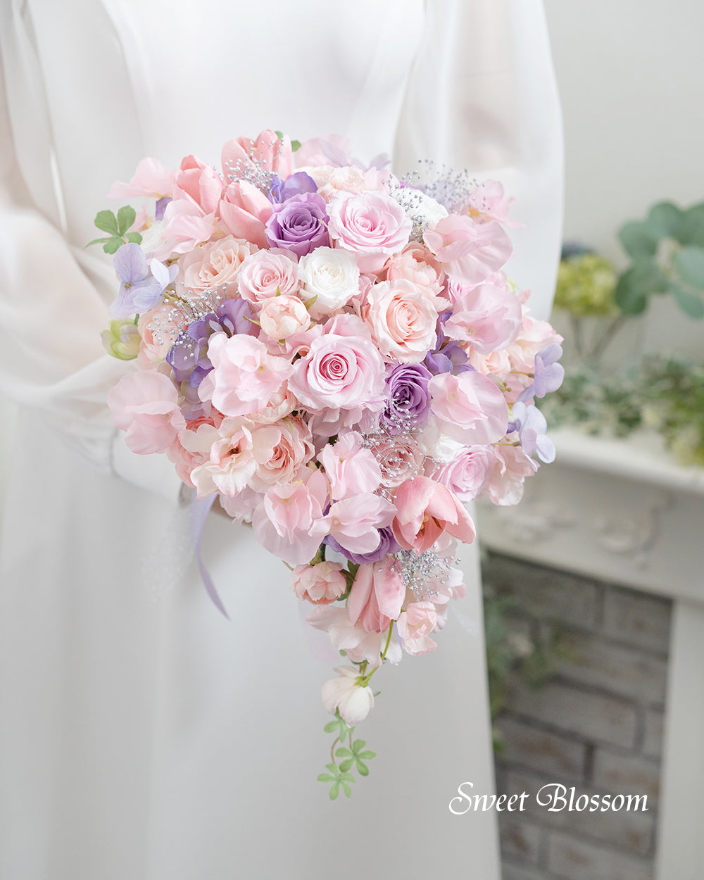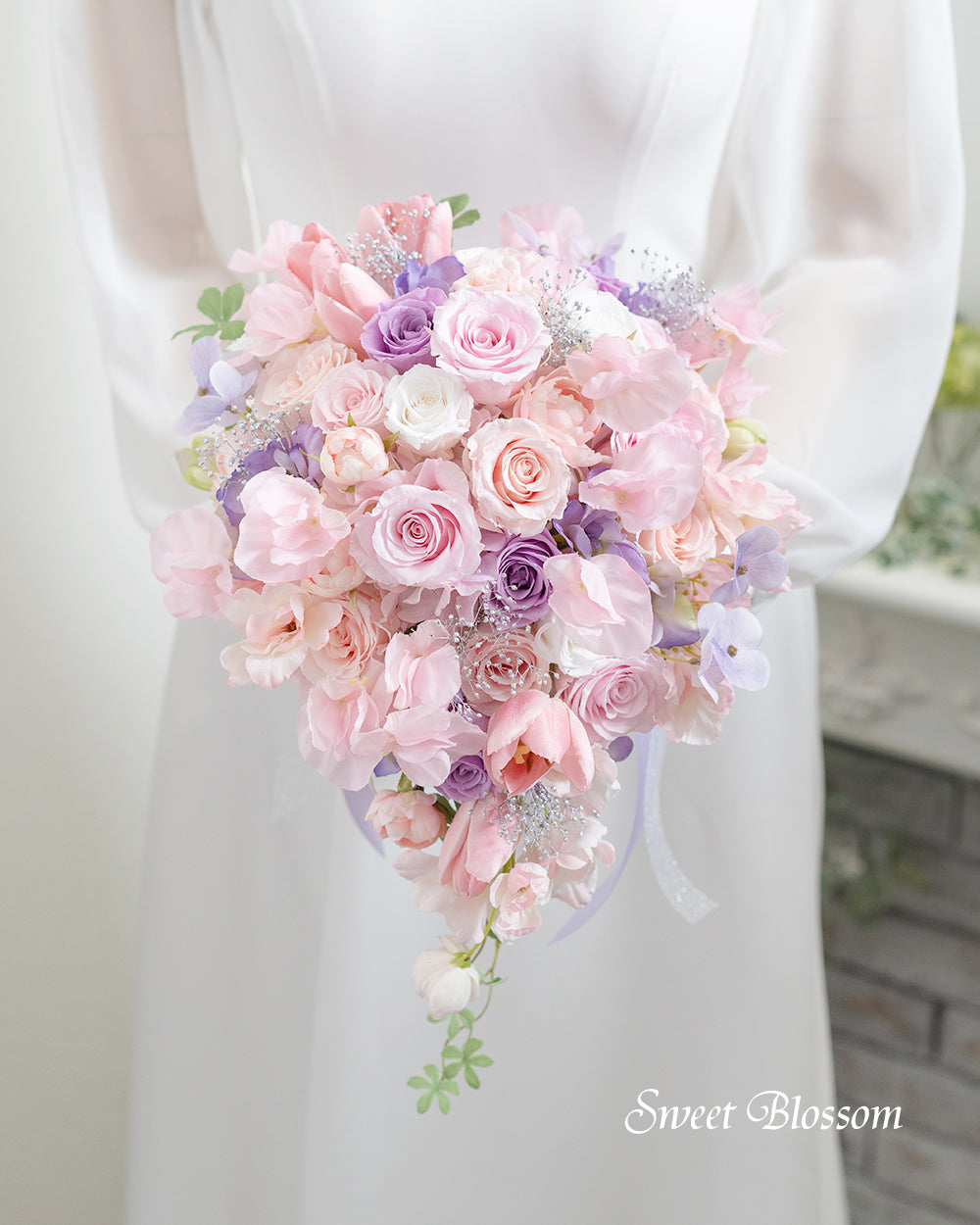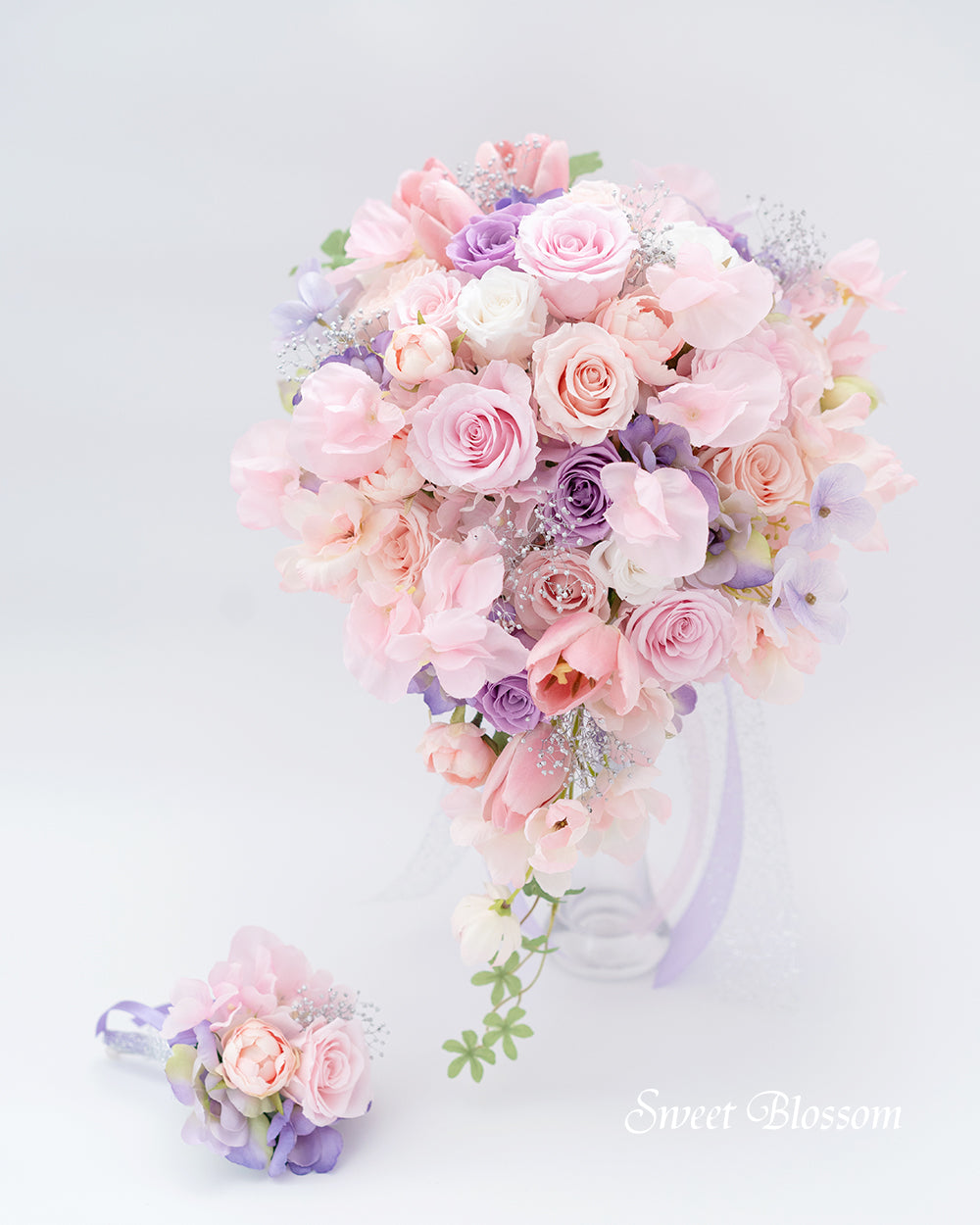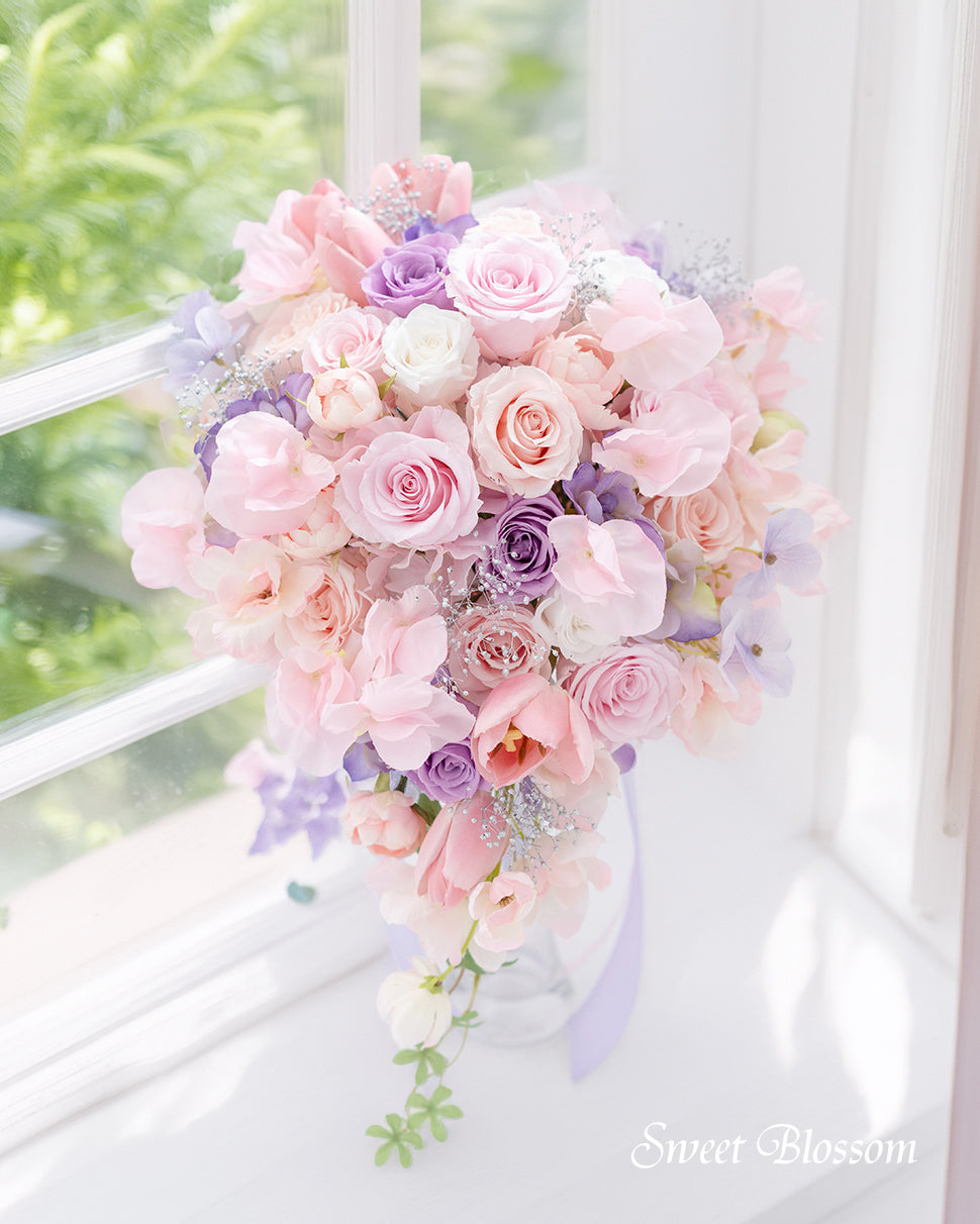 写真はオーダーメイドでご注文いただいた作品の一例で、プリザーブドフラワーのパステル系ピンクのグラデーションにポイントでラベンダー色を加え、シルバーのかすみ草、アーティフィシャルフラワーのスイートピー、チューリップ、ラナンキュラスなどを合わせて流れのある軽やかなティアドロップブーケです。