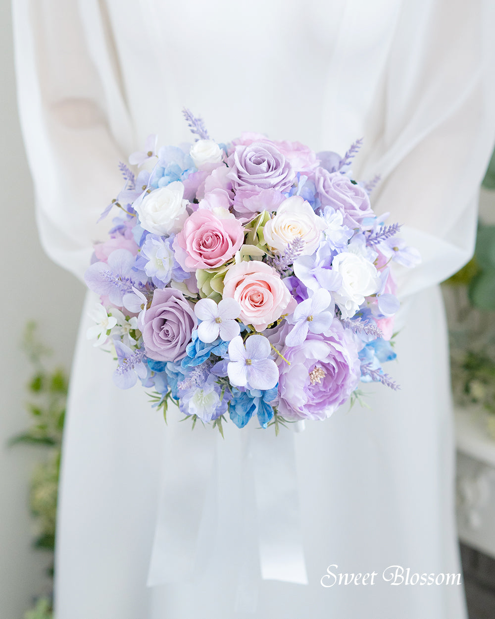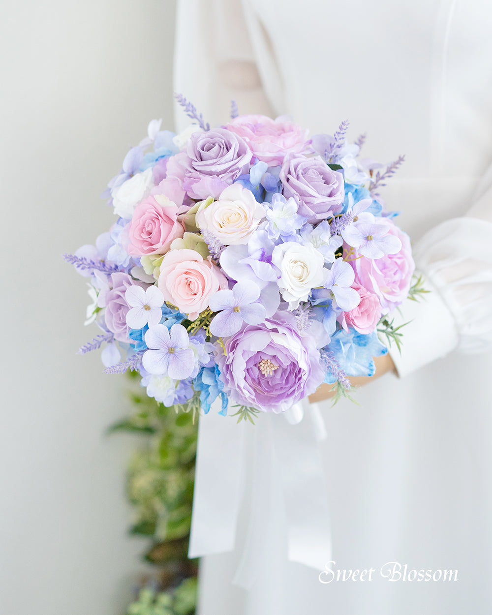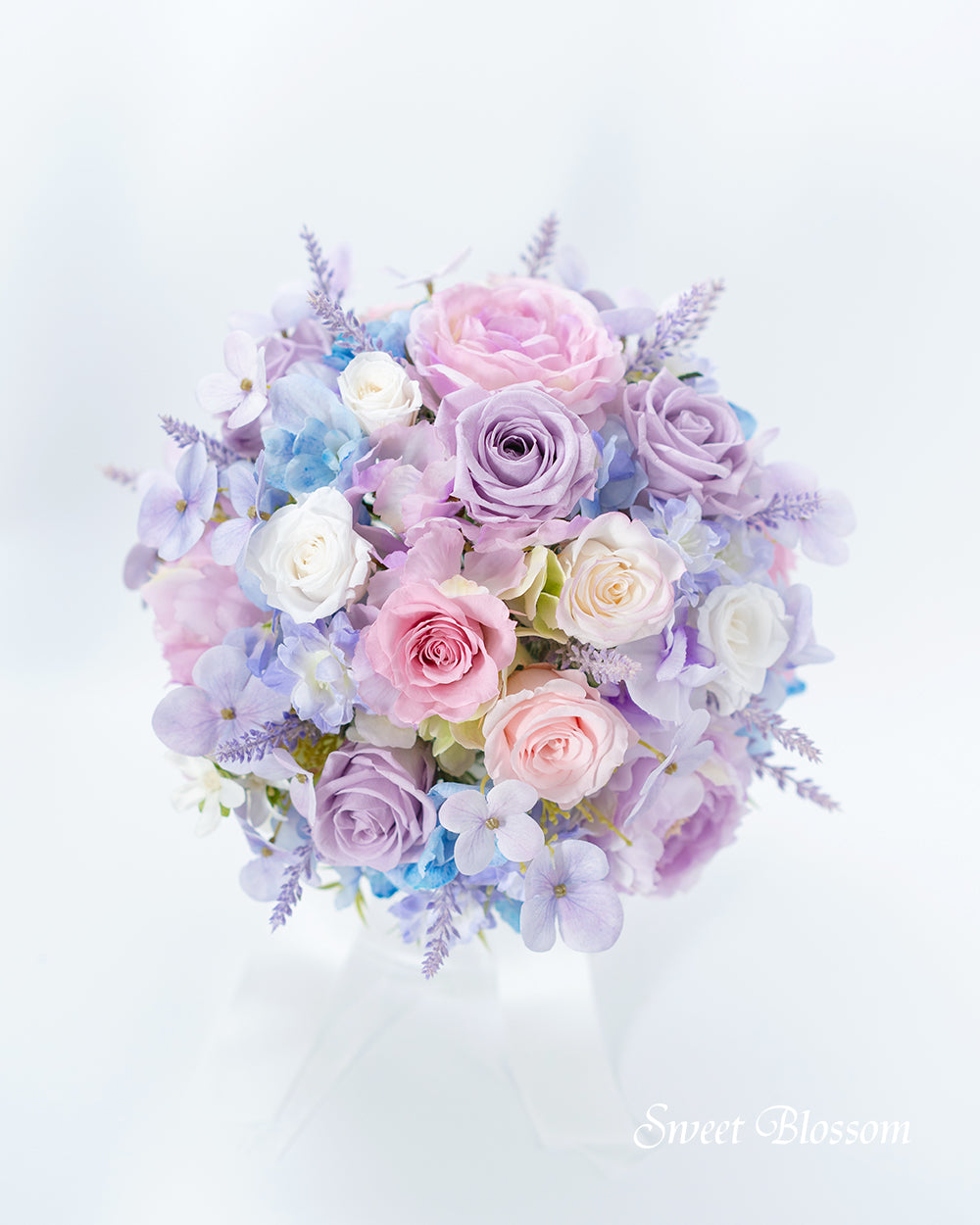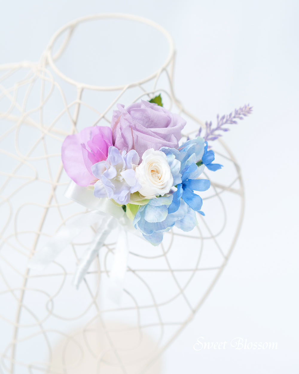 写真はオーダーメイドでご注文いただいた作品の一例で、パステル系で淡めの紫、水色、ピンク、白のお花をプリザーブドフラワーとアーティフィシャルフラワーを取り混ぜて色合わせしたナチュラルブーケとお揃いのブートニアです。
