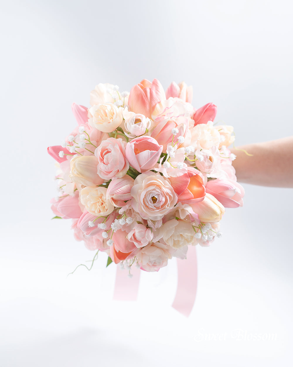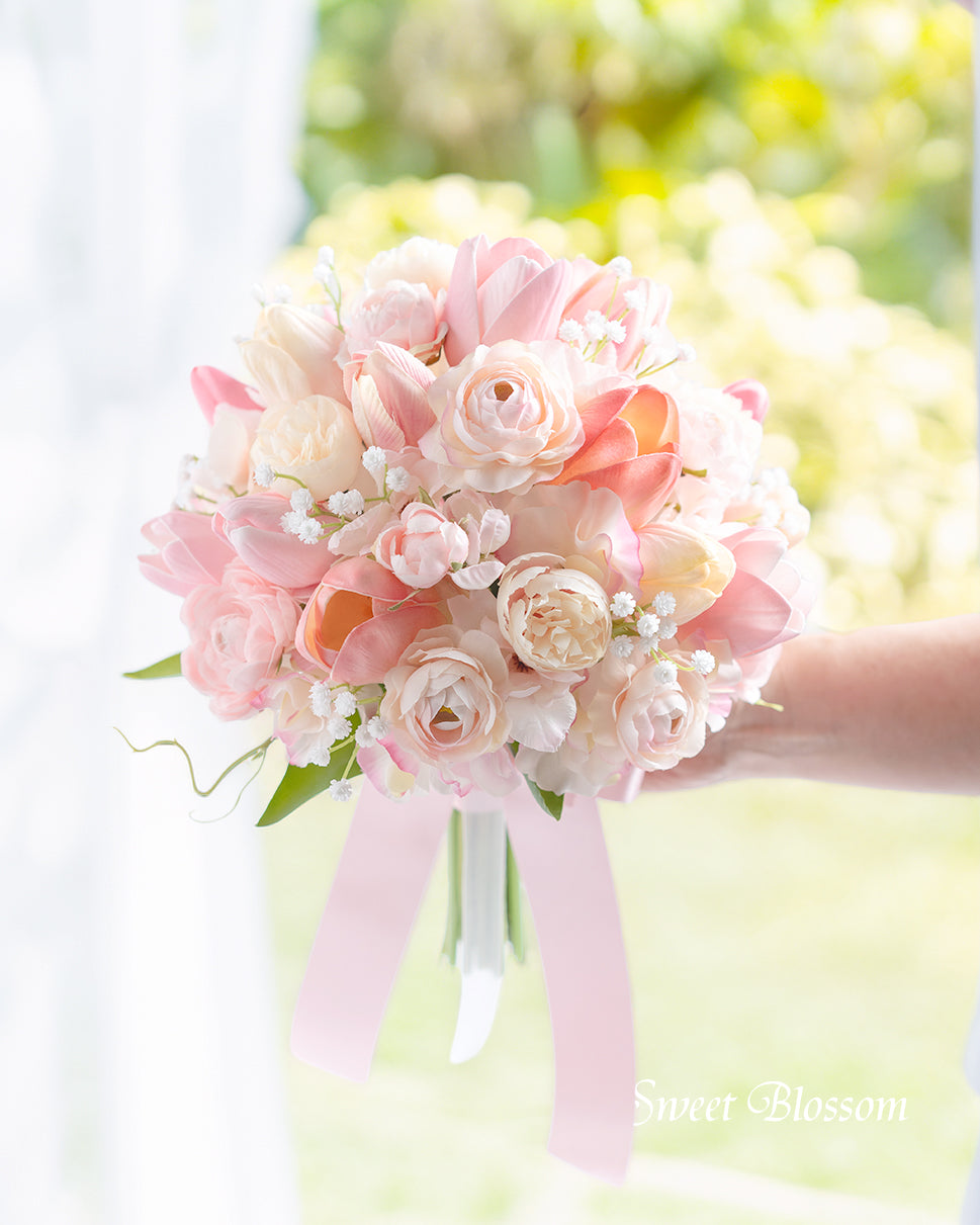 写真はオーダーメイドでご注文いただいた作品の一例で、ピンクやピーチ系のチューリップをメインに同色系のラナンキュラスをあわせナチュラルに組んだふんわり可愛らしいクラッチブーケです。