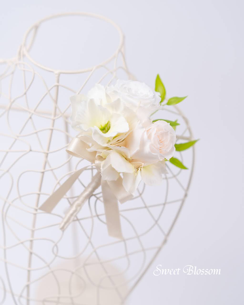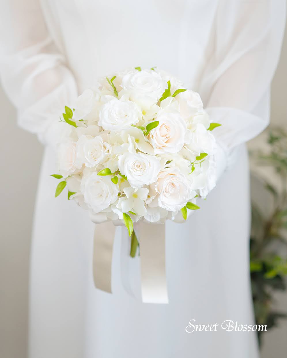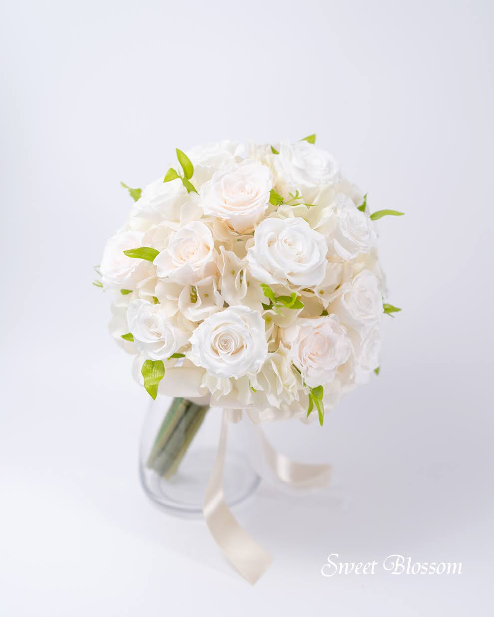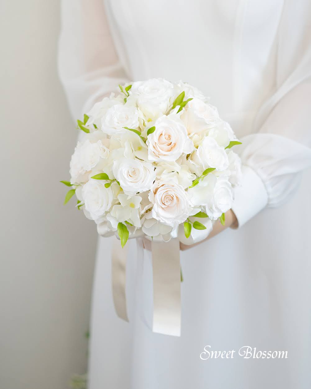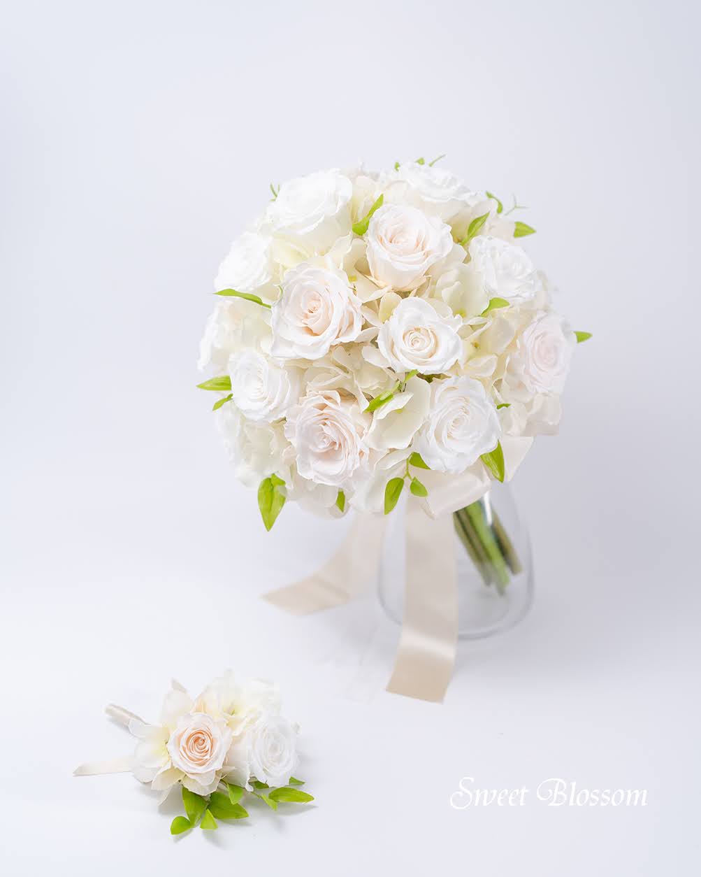 写真はオーダーメードでご注文いただいた作品の一例で、ほんのりピンクがかったシャンパンホワイトと真っ白なピュアホワイトとのホワイト系の2色のバラを使った可愛く清楚なラウンド型のクラッチブーケす。
