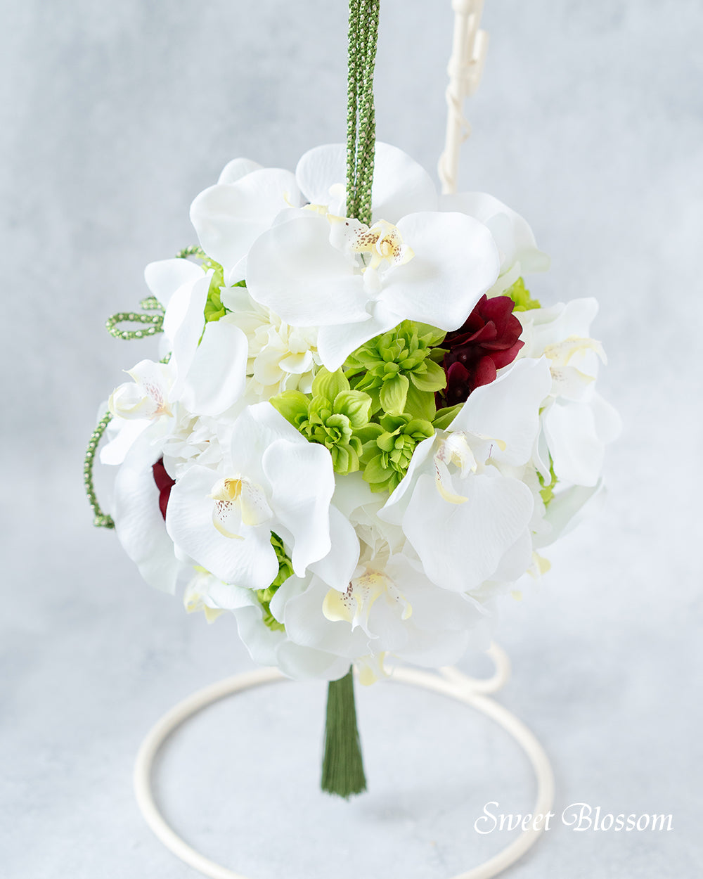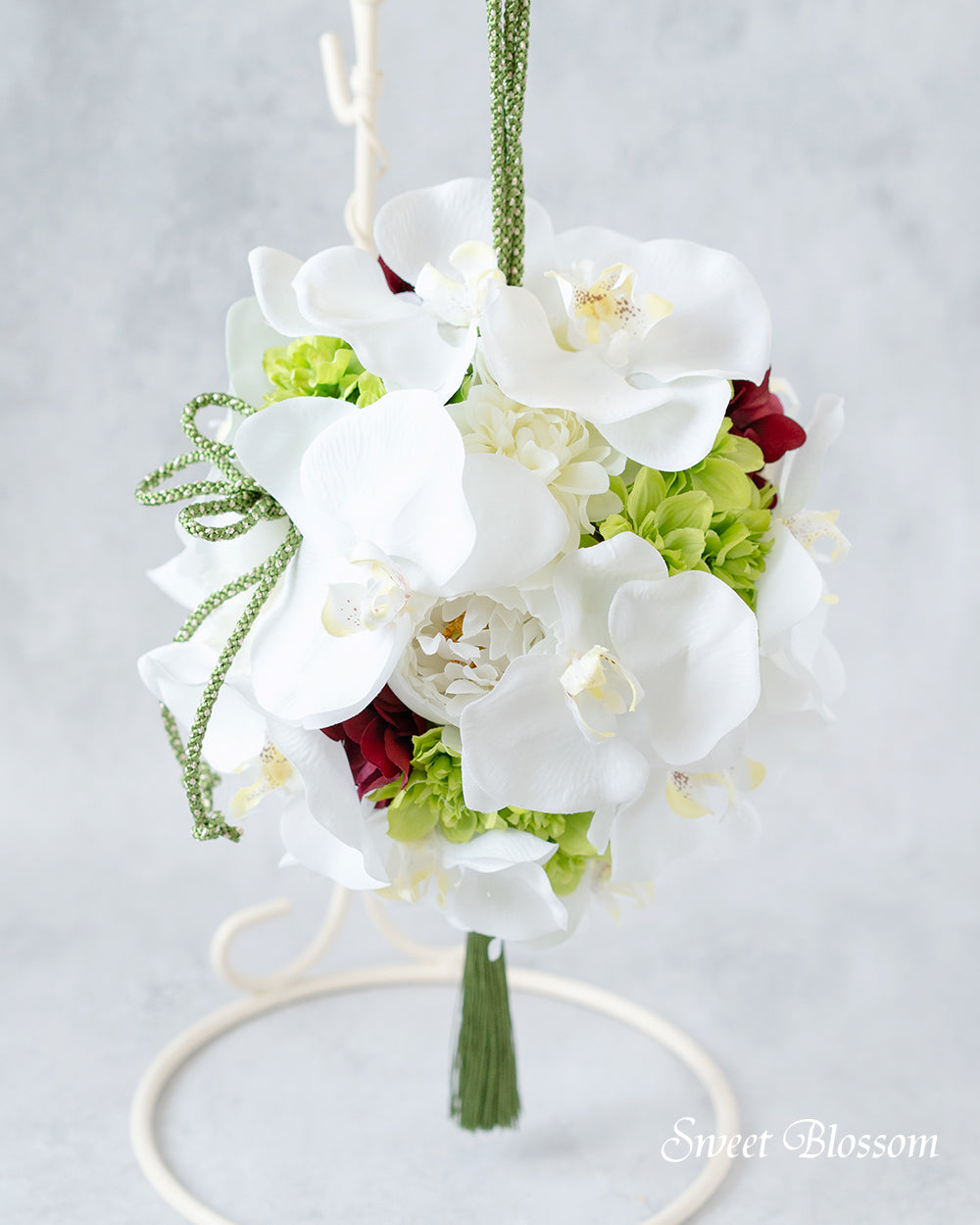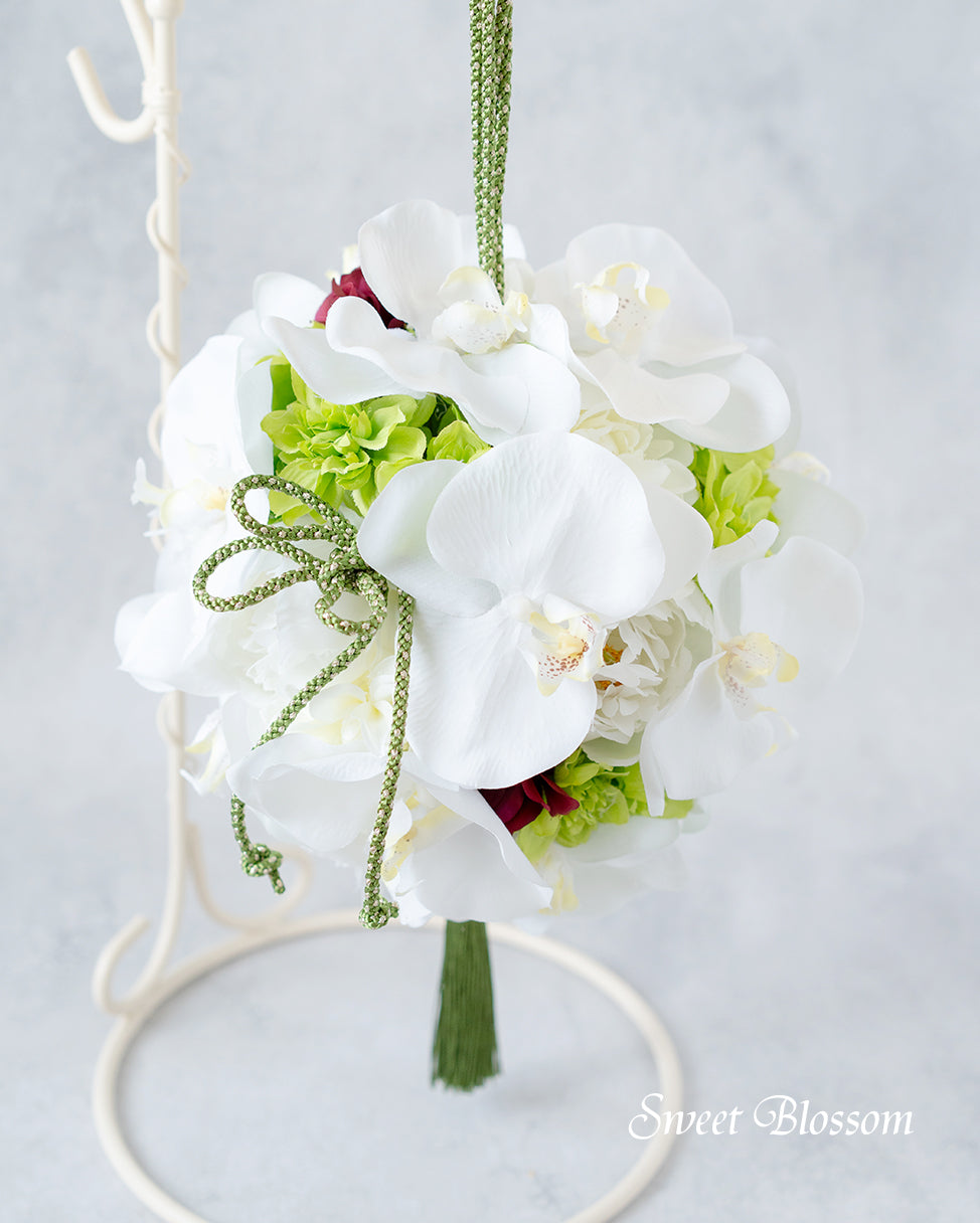 写真はオーダーメイドでご注文いただいた作品の一例で、白の胡蝶蘭をメインに白と黄緑のお花に深めの赤いお花(ワインレッド系)を差し色に入れたボールブーケです。