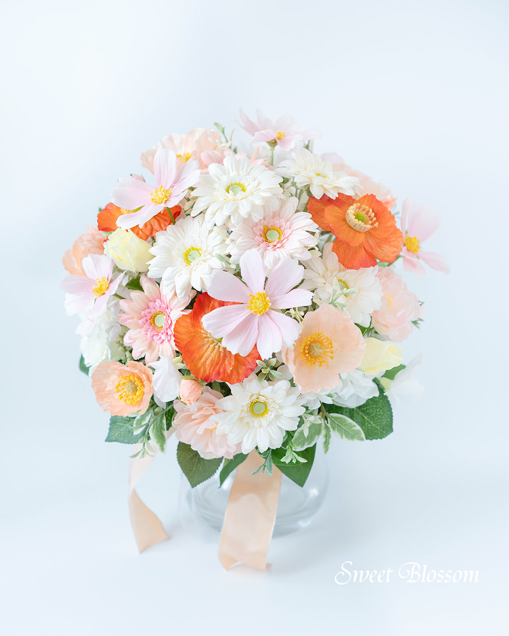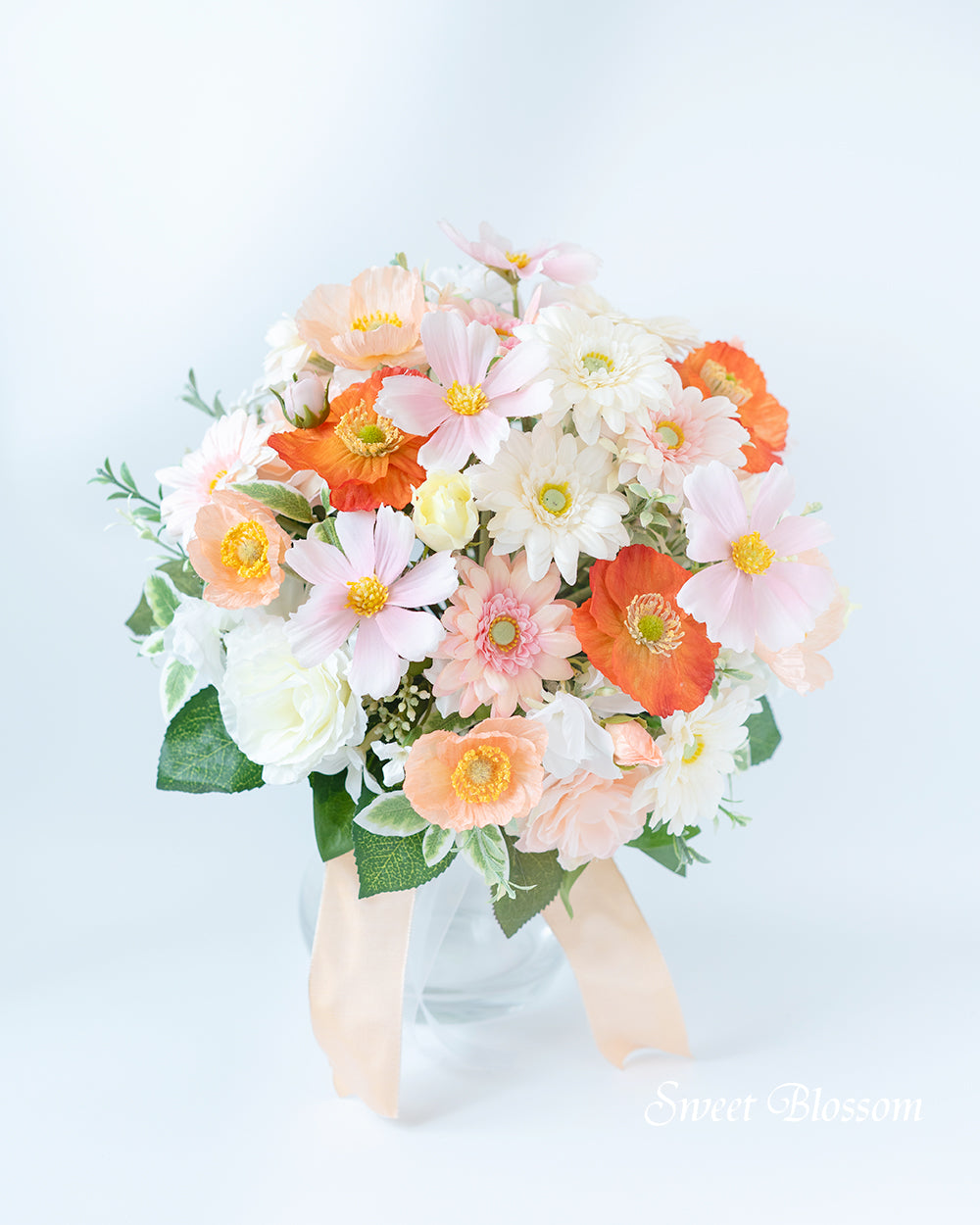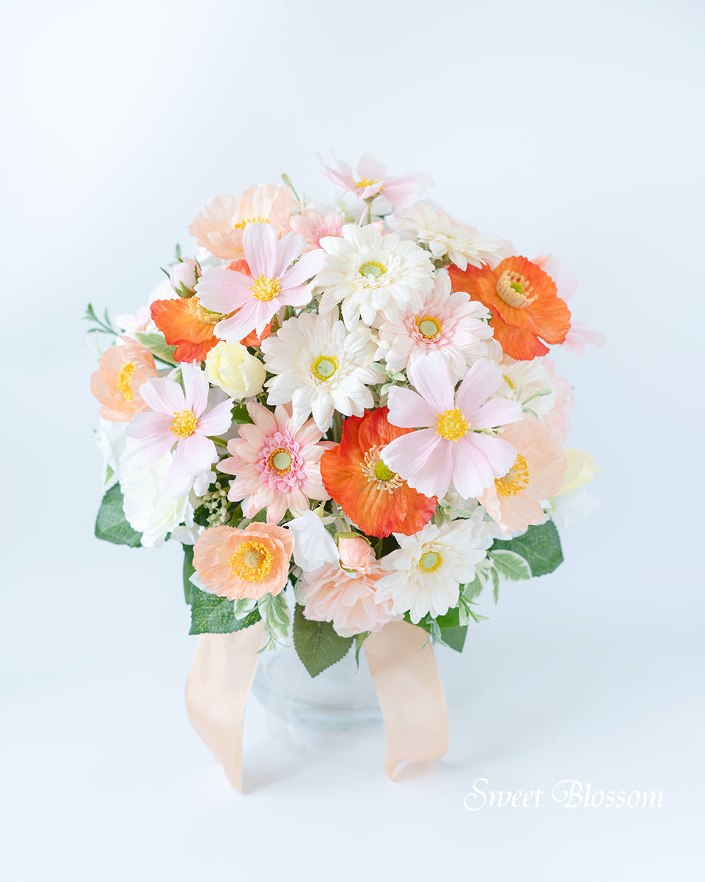 写真はオーダーメイドでご注文いただいた作品の一例で、白のガーベラを中心にバラやひらひらした花びらのポピーなど白、淡いピンクやピーチ系のお色を合わせ