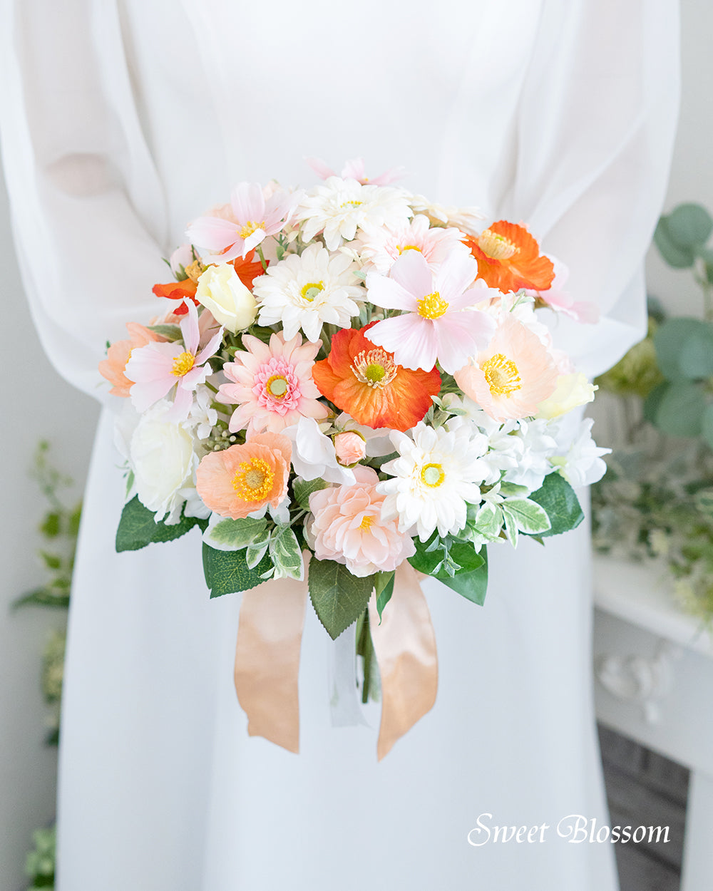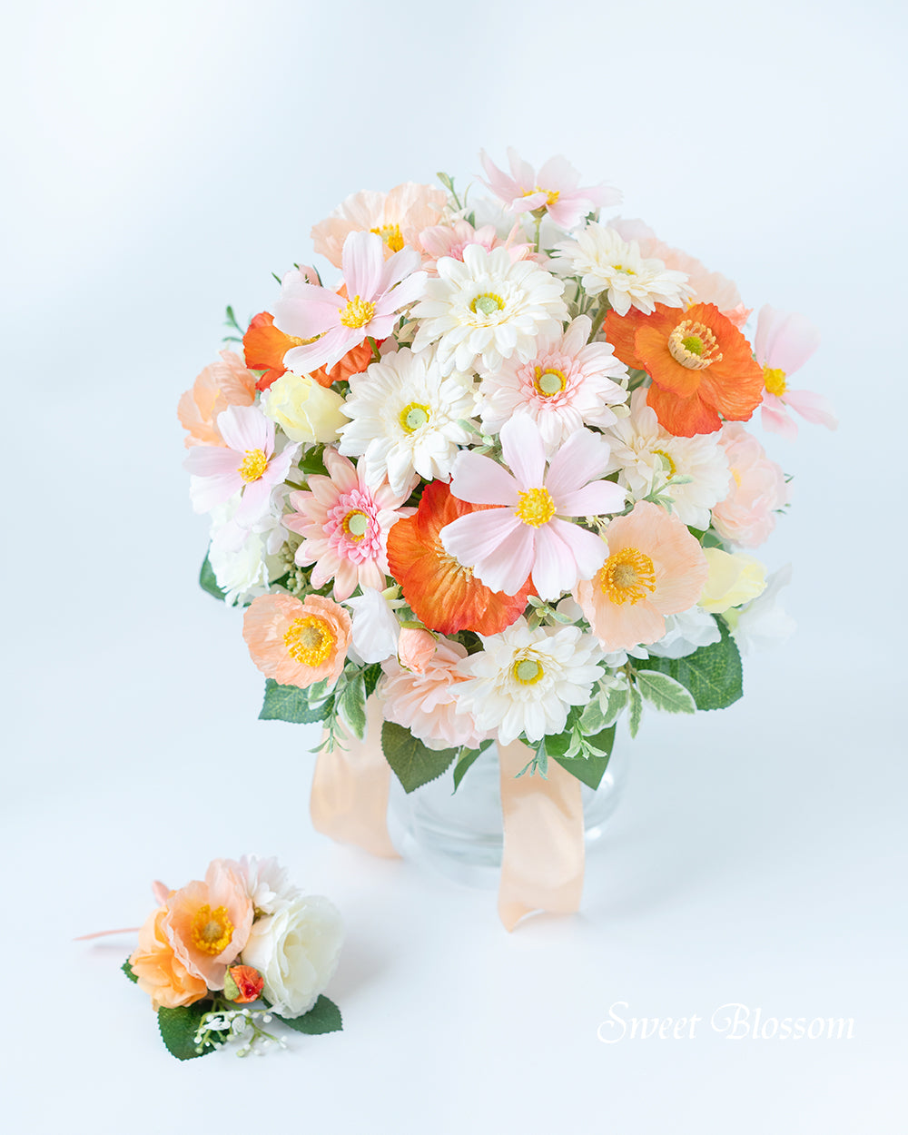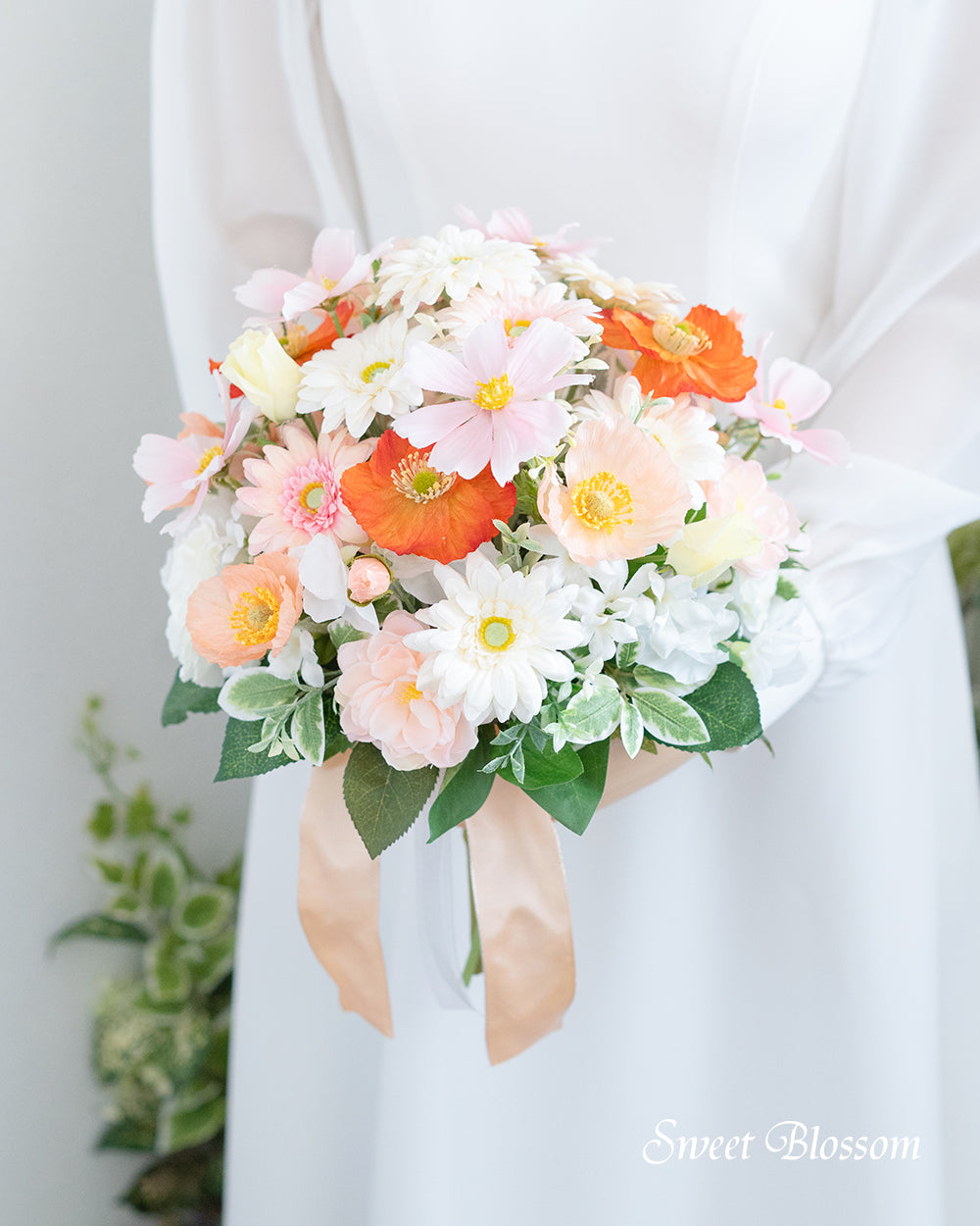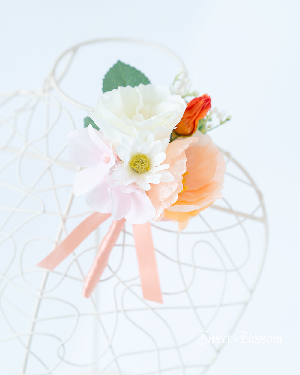 写真はオーダーメイドでご注文いただいた作品の一例で、白のガーベラを中心にバラやひらひらした花びらのポピーなど白、淡いピンクやピーチ系のお色を合わせ