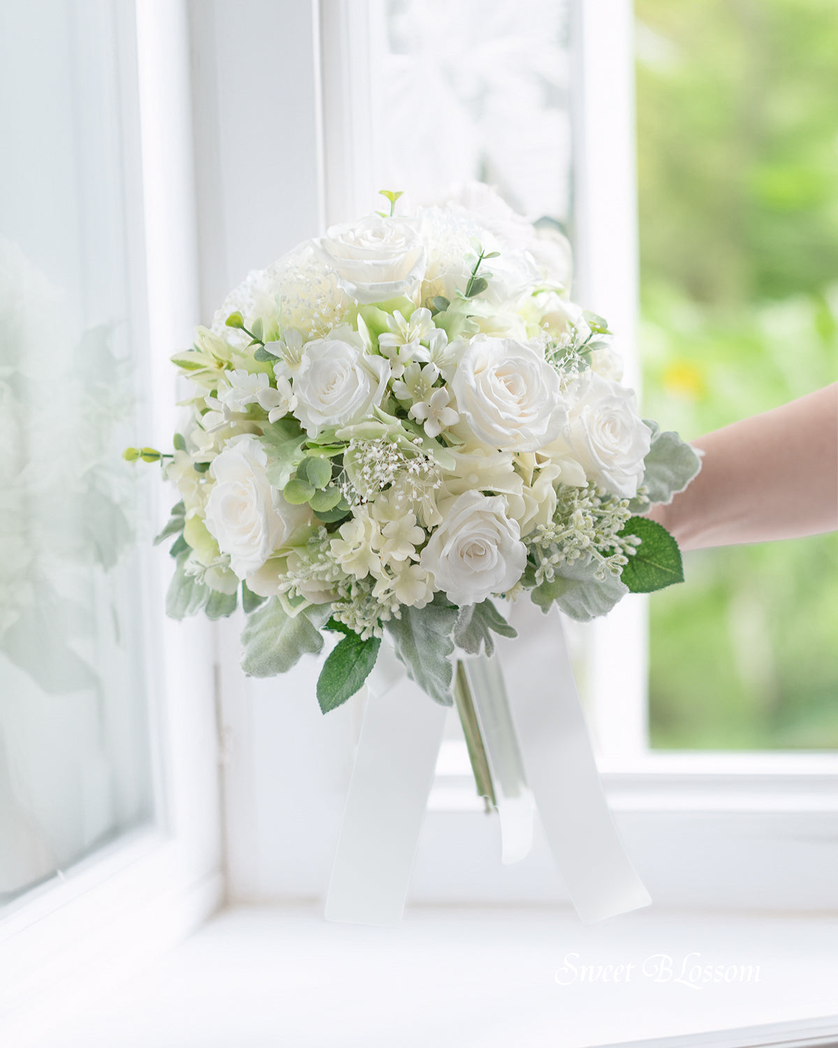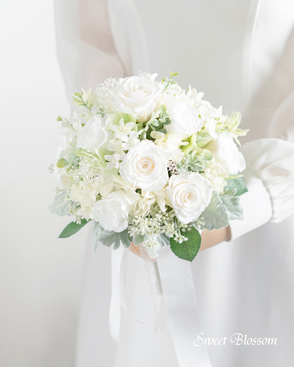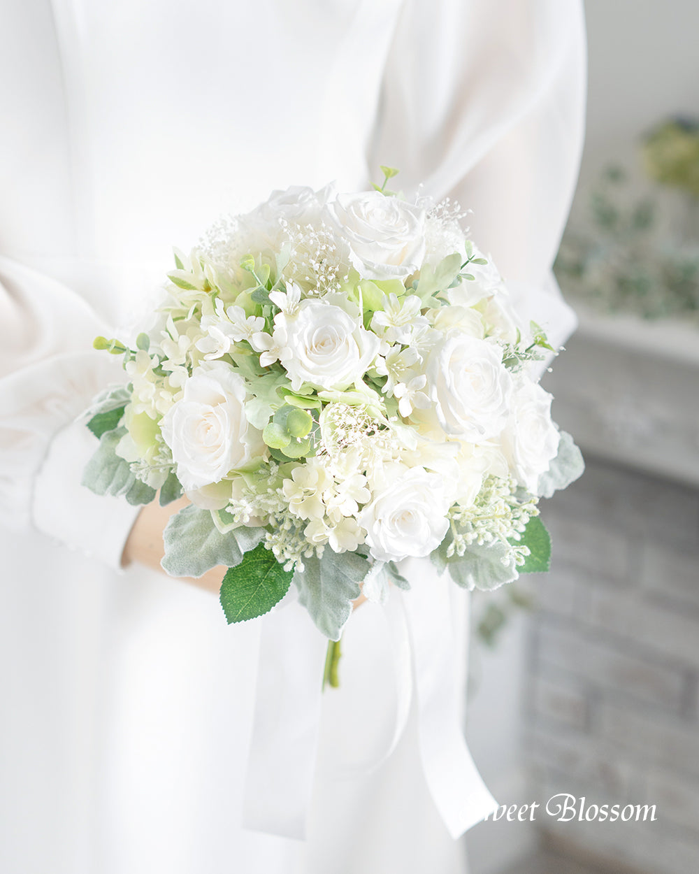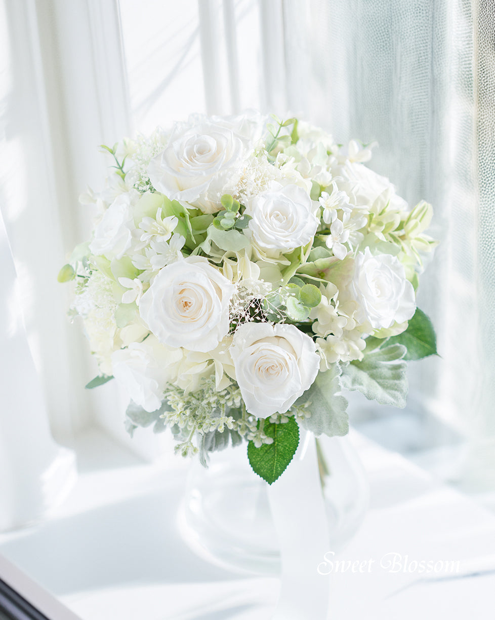 写真はオーダーメードでご注文いただいた作品の一例で、真っ白なピュアホワイトのプリザーブドローズをメインにホワイト&グリーンの組み合わせの王道のウェディングブーケ、茎を束ねたクラッチブーケでよりナチュラルな仕上がりになっています。