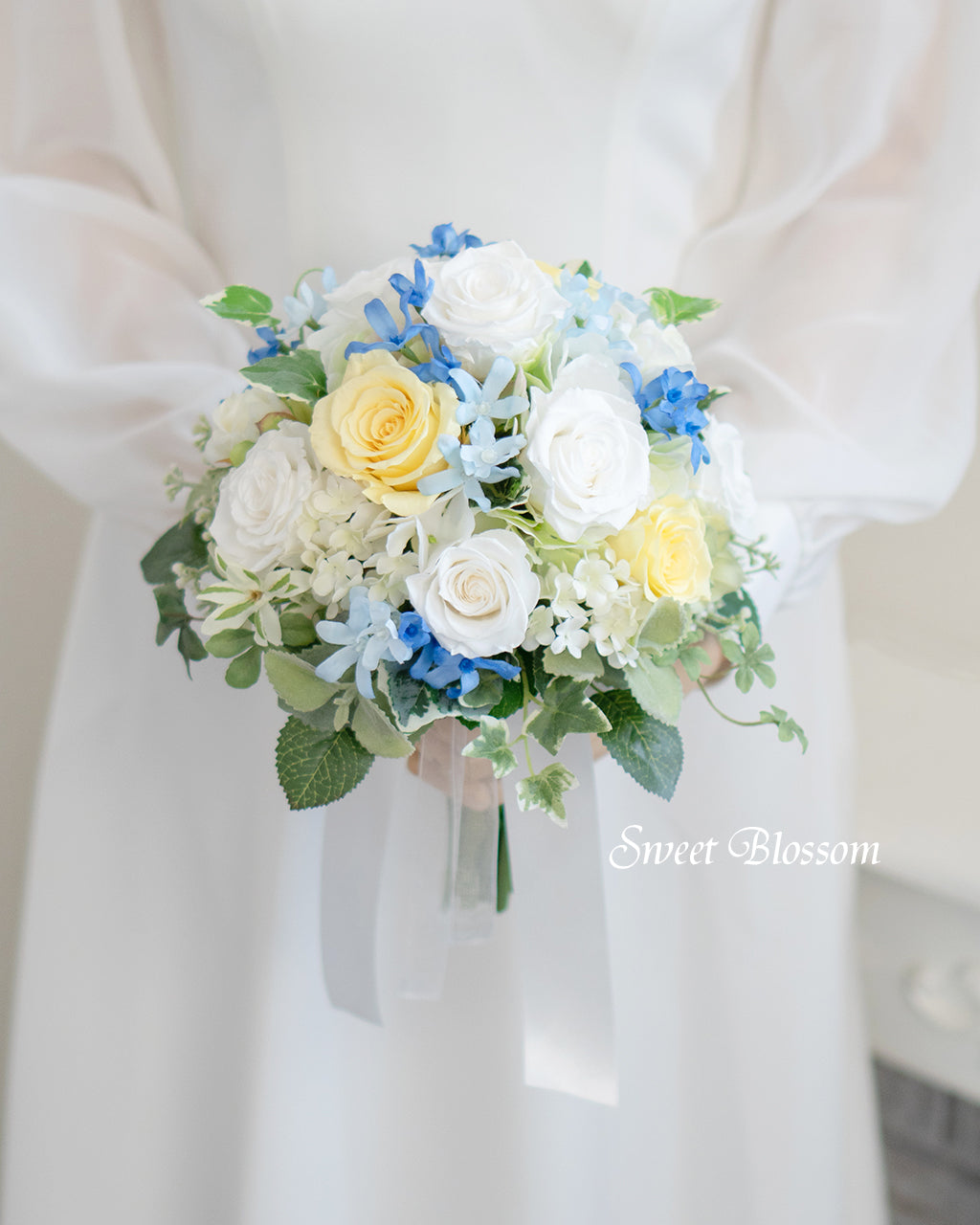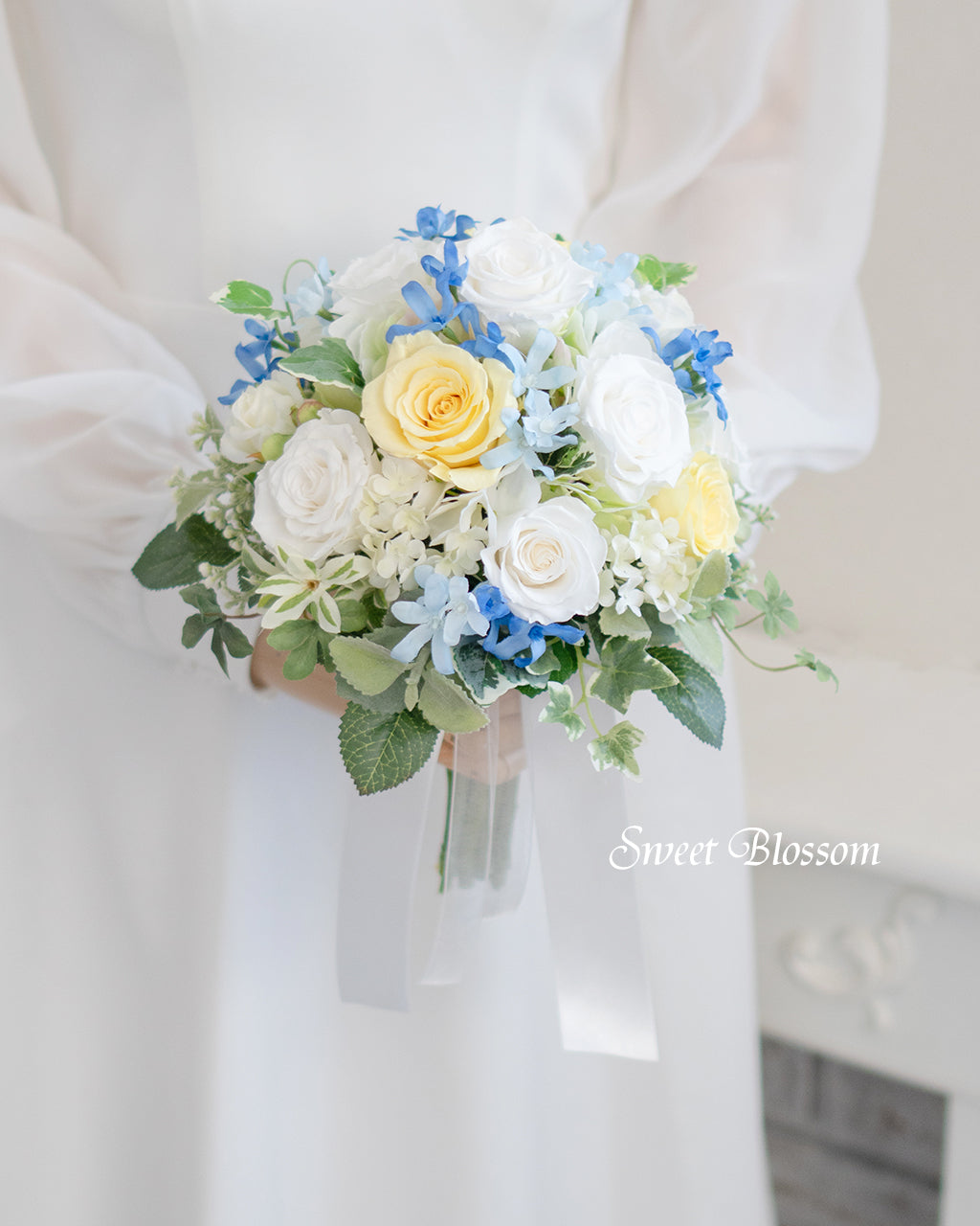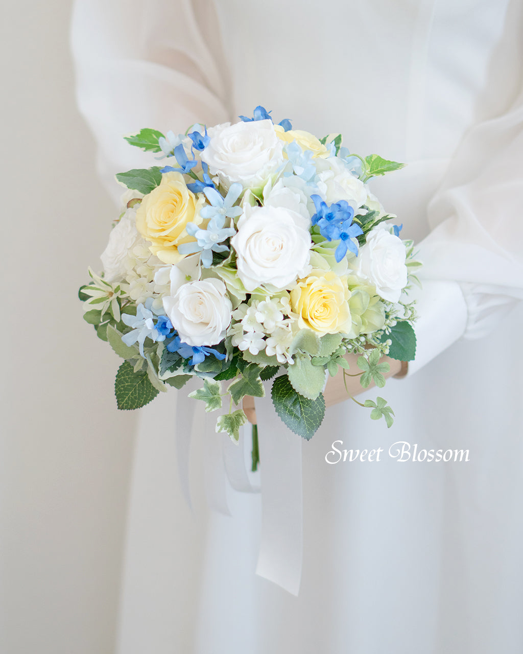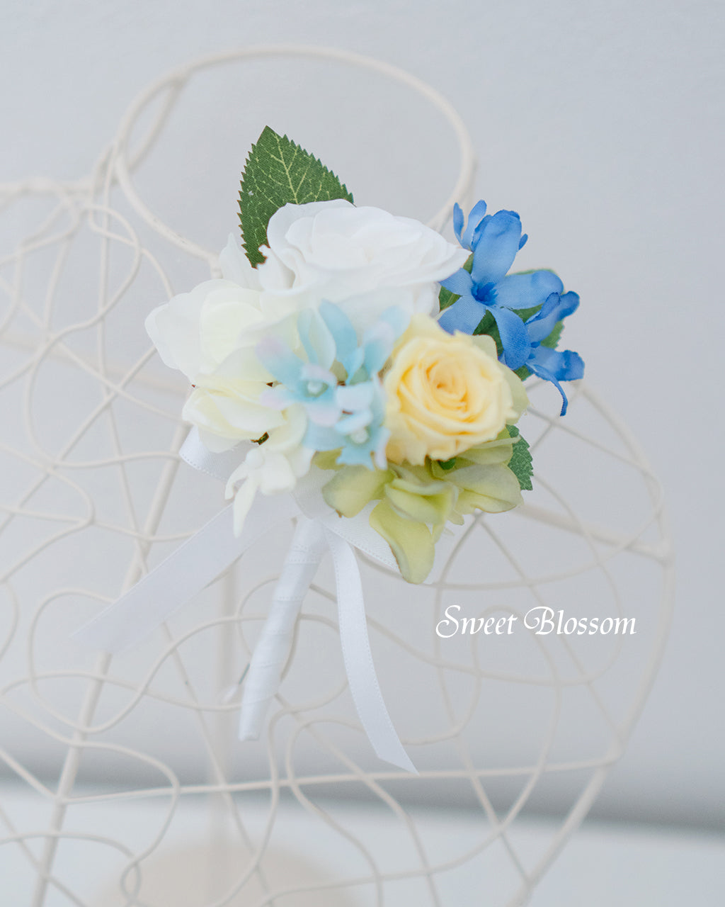 写真はオーダーメードでご注文いただいた作品の一例で、ホワイトとイエローのプリザーブドローズにと濃淡2種類のブルスター、グリーンなどをナチュラルにまとめたクラッチブーケとお揃いのブートニアです。